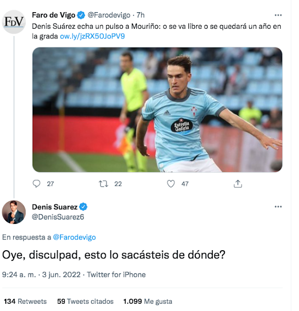 El propio Denis Suárez ha salido al paso de estas informaciones contestando al tuit de Faro de Vigo con un rotundo: “Oye, disculpad, esto lo sacásteis de dónde?”, expresó el salcedano, que ha recibido más de un millar de interacciones positivas tras esta respuesta.
